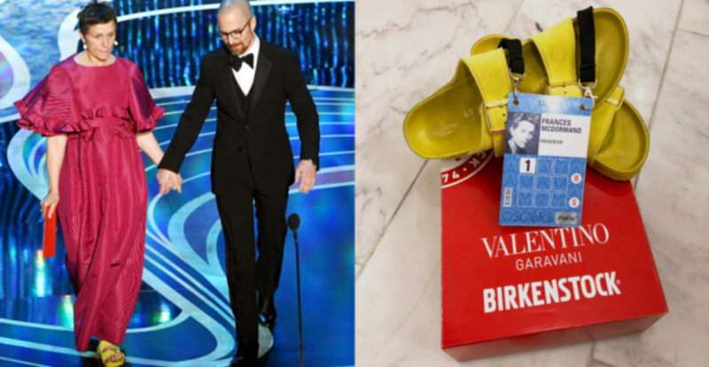오스카 시상식 레드카펫을 밟은 프란시스 맥도맨드는 핑크와 피치 컬러의 발렌티노 드레스에 밝은 노란색 커스텀 버켄스탁을 매치했습니다.