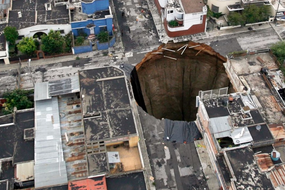3층짜리 공장 건물을 삼켜 15명이 사망한 싱크 홀은 폭 약 18미터, 깊이 약 90미터에 달했습니다. 이 사고는 열대성 폭풍 아가타(Agatha)에 의해 발생했지만 도시가 과거 화산 폭발 당시 퇴적된 물질인 부석으로 이루어진 지대에 건설되었기 때문에 발생했습니다.